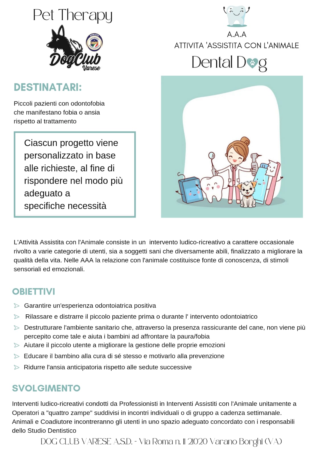 Il termine Pet Therapy (oggi Interventi Assistiti con l’animale) si riferisce alla strutturazione metodologica di progetti finalizzati al trattamento di specifiche patologie con il coinvolgimento dell’animale. Numerosi studi scientifici indicano chiaramente come l’interazione con un animale produca notevoli benefici, tra cui favorisca i rapporti interpersonali. L’animale può svolgere la funzione di ammortizzare in particolari condizioni di stress e di conflittualità e può rappresentare un valido aiuto per i pazienti con problemi di comportamento sociale e di comunicazione, specie se bambini, ma anche per chi soffre di alcune forme di disabilità e di ritardo dello sviluppo psicomotorio: aumenta il buonumore e predispone al dialogo, abbassa lo stress divenendo una fonte di contatto piacevole, una visione rilassante e una percezione di sicurezza e tranquillità perché priva di tutte le implicazioni e i giudizi tipici del rapporto tra umani. Inoltre l’animale può diventare catalizzatore sociale capace di aggregare e distrarre da problemi o sensi di rifiuto, una sorta di mediatore tra la persona e il disagio che permette di aprire insperati accessi e giungere a impreviste soluzioni.